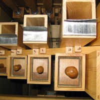 Véritable centre de commande de l’interprète, la console fait l’objet d’un soin tout particulier. Le réglage des mécanismes est effectué avec une extrême précision, afin d’offrir à l’organiste un instrument extrêmement réactif. Dans nos orgues neufs, nous utilisons exclusivement la traction mécanique, technique traditionnelle qui demande une grande minutie mais offre une fiabilité et un toucher inégalés. Nos orgues peuvent, selon la demande, également être dotés de combinateurs électroniques : ce travail est réalisé en sous-traitance par Joël Pétrique.