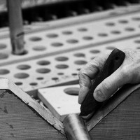 Les alliages d’étain et de plomb utilisés pour les tuyaux sont coulés et rabotés artisanalement dans nos ateliers. Il nous arrive, dans le cas d’orgues neufs uniquement, de travailler en sous-traitance avec Joël Klein, installé à Woerth. Roland Weiss s’est spécialisé dans la confection des tuyaux en métal. Les tuyaux ouverts sont coupés au ton tandis que les bourdons sont à calottes soudées. Les anches sont quant à elles forgées à la main.